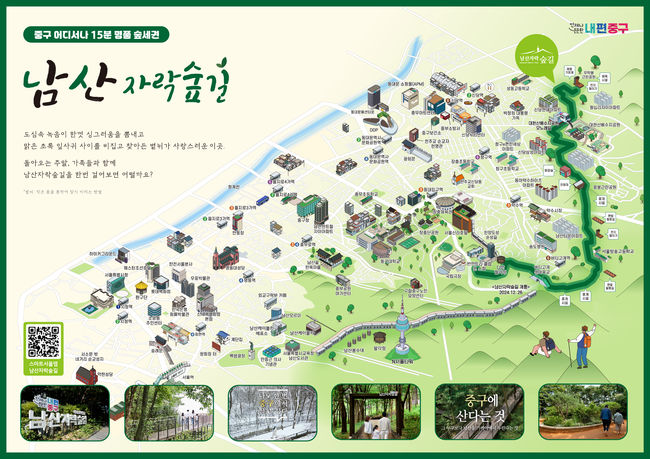 중구 관계자는 “남산자락숲길은 먼 교외의 숲이 아니라, 집 앞 골목길을 따라 누구나 오를 수 있는 도심 속 힐링 공간”이라며 “남산이음 지도가 더 많은 사람들이 남산의 아름다움을 일상에서 쉽게 누릴 수 있는 길잡이가 되길 바란다”고 전했다.