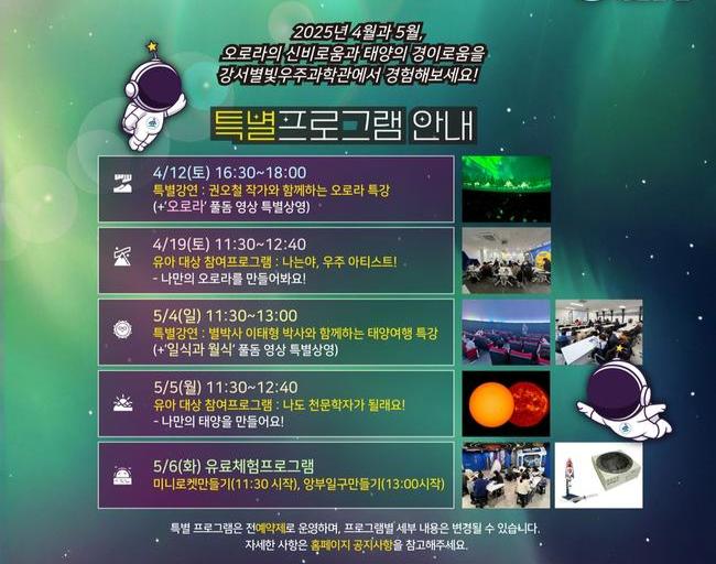 심재현 강서별빛우주과학관장은 "과학의 날과 어린이날을 맞아 우주에 관심 있는 어린이들을 위해 `오로라, 그리고 태양` 특별기획전을 준비했다"며 "이번 특별전을 통해 우주와 더 가까워지는 특별한 시간이 되길 바란다"고 말했다.