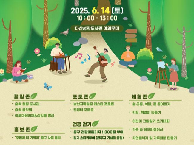 서울 중구(구청장 김길성)는 오는 6월 14일(토) 오전 10시부터 오후 1시까지 다산성곽도서관과 남산자락숲길 일대에서 ‘남산자락숲길 페스타’를 개최한다고 밝혔다. 이번 행사는 남산자락숲길 전면 개통을 기념하고, 도심 속 숲세권을 주민 일상 속에 보다 가깝게 자리잡게 하려는 취지로 기획됐다.