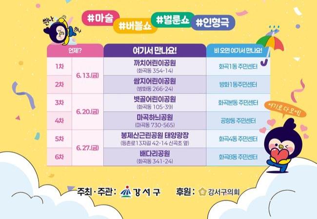공연은 매주 금요일 5시 30분부터 7시까지 진행된다. 13일(금) 까치어린이공원(화곡1동 소재)과 쌈지어린이공원(방화1동 소재)을 시작으로, 볏골어린이공원(화곡본동 소재), 마곡하늬공원(공항동 소재) 등 관내 6개 공원에서 순차적으로 열린다.