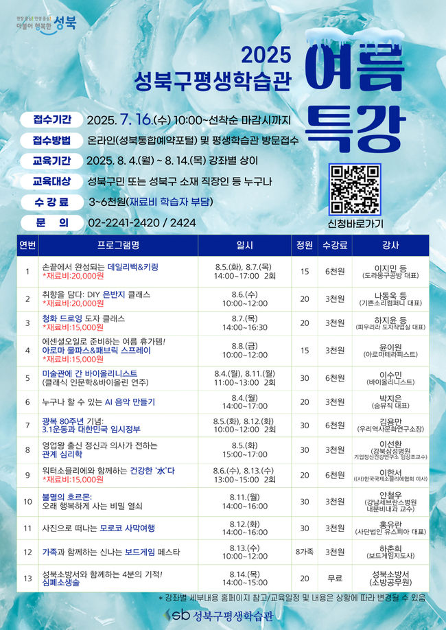 서울 성북구가 지역 주민들의 지적 호기심과 일상 속 배움을 지원하기 위해 오는 8월 4일부터 14일까지 ‘2025 성북구평생학습관 여름특강’을 운영한다.