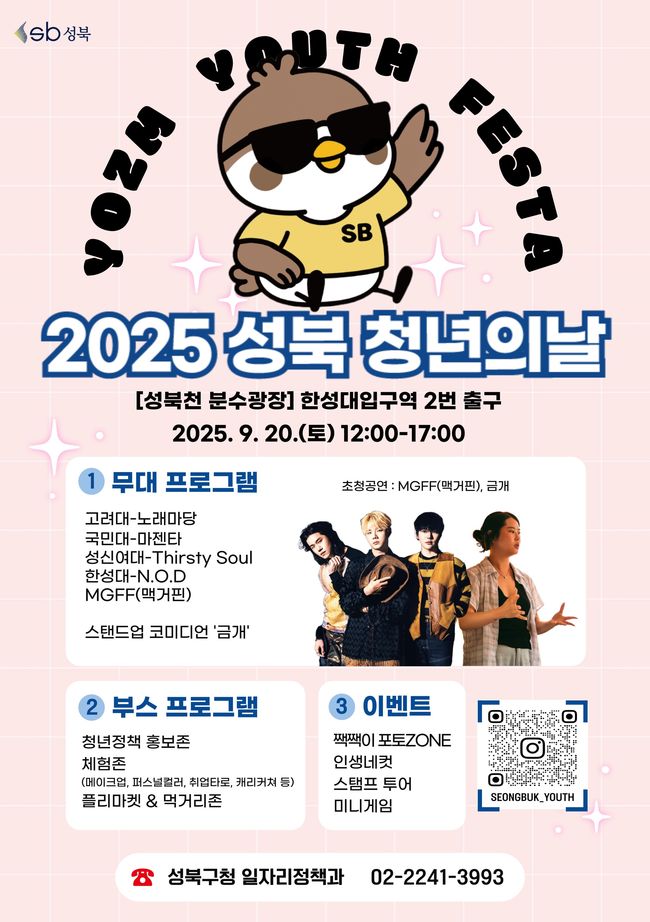 둘째 날인 20일에는 청년의 날 취지에 맞춰 공연과 체험 중심의 축제가 펼쳐진다. 밴드 맥거핀과 고려대·국민대·성신여대·한성대 동아리팀이 무대에 오르고, 스탠드업 코미디언 금개도 참여해 청년들과 소통한다.