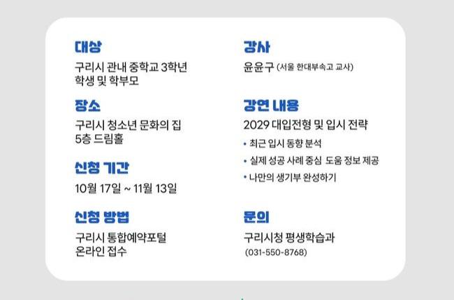 이번 설명회는 변화하는 대입 전형에 대한 이해를 돕고, 수험생 맞춤형 진학 전략을 안내하기 위해 마련됐다. 설명회는 구리시청소년문화의집에서 11월 중 총 3회에 걸쳐 진행된다. 각 회차는 2시간 동안 진행되며, 강의 후 질의응답 시간도 제공된다.