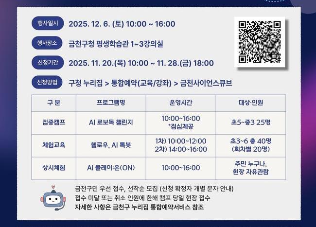 유성훈 금천구청장은 "이번 캠프가 청소년들에게 AI 및 로봇 기술에 대한 흥미를 심어주고, 미래 사회의 주역으로 성장하는 데 필요한 창의적 사고력을 키우는 좋은 기회가 되기를 바란다"며, "앞으로도 청소년들이 미래 기술을 마음껏 경험하고 꿈을 펼칠 수 있도록 적극 지원하겠다"라고 밝혔다.