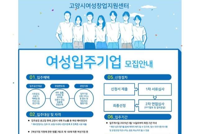 고양특례시(시장 이동환) 여성창업지원센터는 우수한 사업 비전과 아이템을 보유한 여성 예비창업인 및 창업 초기 여성기업인을 대상으로 신규 입주기업을 모집한다.