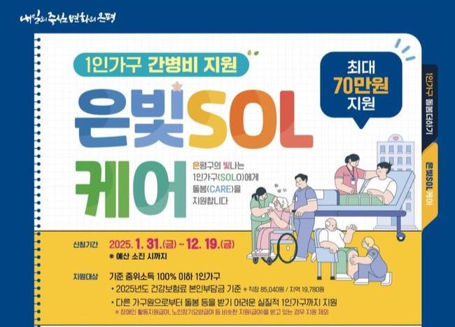 은평구(구청장 김미경)는 입원으로 돌봄이 필요한 1인가구에 최대 70만 원의 간병비를 지원하는 ‘은빛SOL케어’ 사업을 시행한다고 밝혔다.