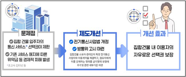 이는 집합건물 소유주가 특정 전기통신사업자와 독점계약을 체결해 입주자에게 특정 서비스를 강요하는 관행을 막기 위한 조치다. 앞서 정부는 이러한 행위를 금지하는 「전기통신사업법」 개정안을 지난 1월 30일 공포한 바 있다.