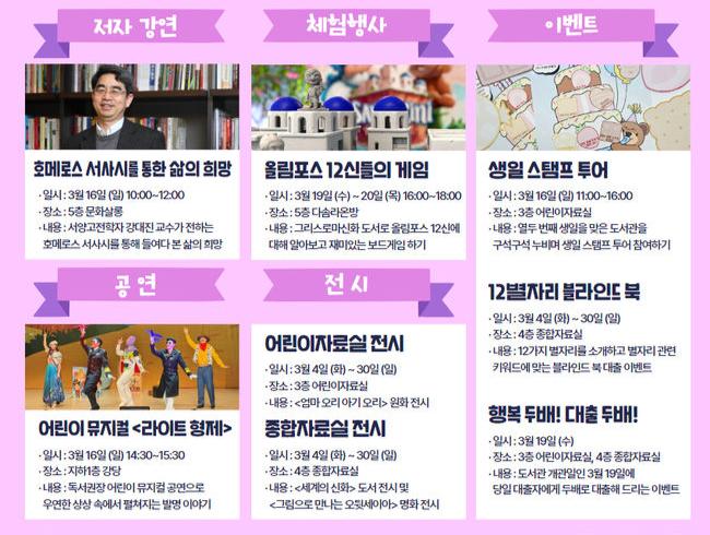 3월 19일(수)부터 3월 20일(목)까지는 어린이들을 위한 체험행사 <올림포스 12신들의 게임>이 진행된다. 어린이들이 사랑하는 그리스로마신화 도서로 올림포스 12신에 대해 알아보고, 그리스로마신화와 관련된 재미있는 보드게임을 하며 신나는 시간을 보낼 기회다.